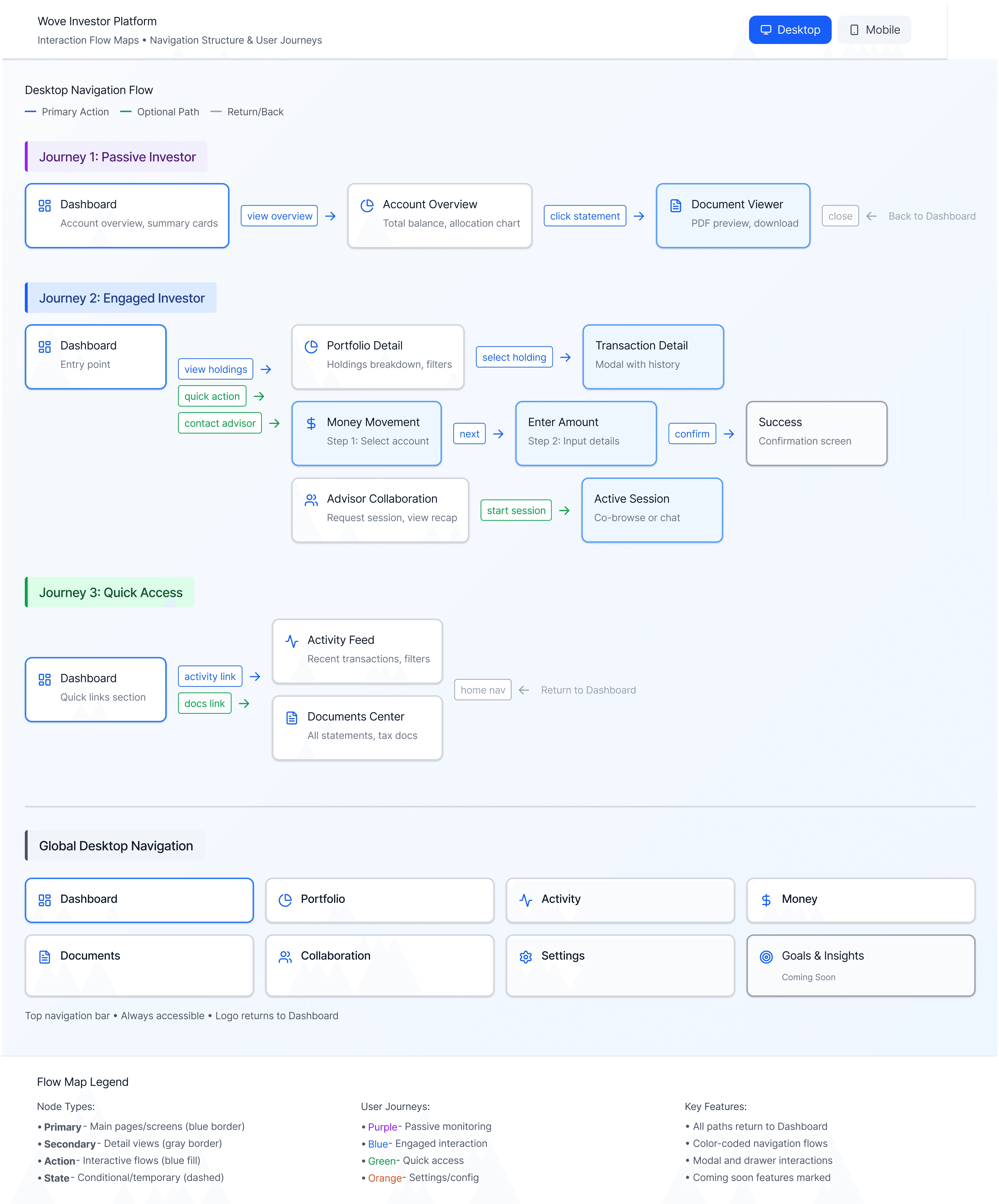 The original flow maps and user journeys still anchor this iteration. They now serve as inputs for a smarter system—one capable of learning from investor behavior and surfacing relevant insights automatically, closing the gap between usability and intelligence.